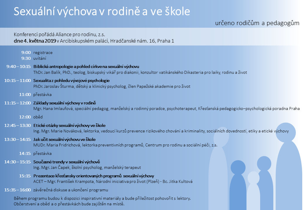 4. 5. 2019 Vás zveme na konferenci Sexuální výchova v rodině a ve škole, kterou pořádáme v Arcibiskupském paláci, Hradčanské náměstí 16, Praha 1. Protože znovu probíhají revize Rámcově vzdělávacích programů (RVP), cítíme potřebu opět otevřít toto důležité téma a říci si, jak to dnes vypadá.
